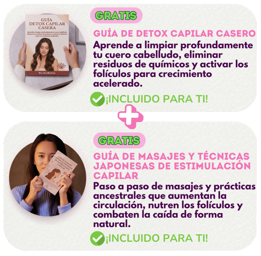 Son bebidas naturales, hechas con ingredientes simples pero estratégicos, que activan el crecimiento acelerado del cabello y bloquean su caída. Fórmulas utilizadas durante generaciones en Japón, ahora adaptadas para ti, que nutren tu cuerpo desde adentro hacia afuera, dejando el cabello más fuerte, denso y lleno de vida.